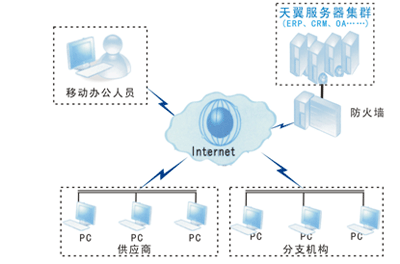 采用瑞友天翼应用接入系统,把各销售中心和总部生产制造中心连接在一个系统平台上,资源共享,原来各自独立的ERP、CRM、SCM、OA等系统,现在可以在一个系统里进行交换,而网络费用只有以前的1/8甚至更低,并实现在3kb/s的传输速率下流畅运行,大大降低了制造企业网络的投入成本。原来领导和员工外出办公,通过Modem拔号接入到办公网,速度很慢。使用瑞友天翼应用接入系统后,可通过WLAN、CDMA、GPRS等任意的上网方式接入企业网,无时间地点限制连接到公司瑞友天翼服务器群组,及时了解库存、生产、销售等等情况,提高了工作效率。
