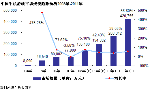 中国是目前世界上最大的手机消费国,工信部数据显示,2005年至2009年3月底,中国移动电话用户从3.7亿户增至6.7亿户,年均增幅达20.3%,中国如此庞大的手机消费群体为手机游戏的发展提供了优厚的受众基础,2008年手机游戏总用户数达到3300万人,同比增长37.5%,活跃用户数达到698万户,其中大部分是24岁以下的各级在校学生。市场规模在2009年预计将达到19.44亿元人民币。虽然手机游戏行业在近些年的发展中交出了不错的答卷,但始终没有达到客户以及潜在投资者的预期,甚至很多专业人士开始对手机游戏行业降低了信心和兴趣。终端适配难、网络限制、速度不稳定、高资费、优秀产品少、产品生命周期短等问题既是目前制约手机游戏发展的最大障碍,也是未来行业发展的关键成功因素。