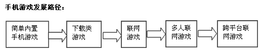 手机游戏发展到今天,已经形成了两大群体,即单机游戏和网络游戏。从最初单一的内置手机游戏一路走来,经过下载类游戏、联网游戏、多人联网游戏等中间过渡产品的更新换代,才得以发展到现在的跨平台联网游戏模式。从用户体验上进行划分,可以分为:棋牌类、角色扮演类、益智类、动作冒险类游戏等等,其中,休闲类游戏是中国手机游戏玩家最喜欢的游戏类型。2008年,手机单机游戏付费金额超过10亿元人民币,而手机网游仅为3亿,由此可见,手机网游存在巨大的发展空间。
