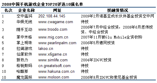 3G时代翩然而至,在其飞扬的翩翩长袖下,服务商都在竭尽全力配合着它的舞步。手机游戏开发商更是个个摩拳擦掌,都力争在这个相比以往更加豪华、更加广阔的舞台上舞出绚丽多姿的华彩乐章。诚然,手机游戏行业在等待乐曲的高潮,但同样,他们也在随着乐曲调教着自己的舞步,行业特征重新定位、新颖的盈利模式、产业链各环节的提升、运营模式升级,等等。只有自己以最快的速度跳出3G舞步,才能占得先机,比对手获得更早、更持久的关注和掌声。目前,群雄并起、四方割据,行业龙头尚不明朗,未来的路仍存在着变数。但这种局面,正是风险投资者希望看到的,2008年中国手机游戏企业前十强中,仍然存在不少好的企业等待风险投资的发掘,发掘出最有潜力的企业,帮助其成为3G概念下手机游戏行业最受人关注的明日之星。