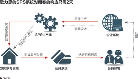 不过,令人称奇的并非其鲜明的设计风格—自创立以来,歌力思的出口订单是零,但却凭借国内市场连续14年保持30%以上的速度增长,在中国重点城市拥有近280家专卖店,其2008年在深圳的纳税额达8000万元。考虑到2008年深圳口岸出口纺织服装同比下降三成,出口型服装企业的日子愁云惨雾,就不难理解歌力思为何能获得投资者的青睐。不仅是这些,歌力思所展现出来的设计和生产能力—单季可达400多款,其快速反应能力—从设计成型到量产只需2天,则暗示了这家企业在品牌之外的战斗力。