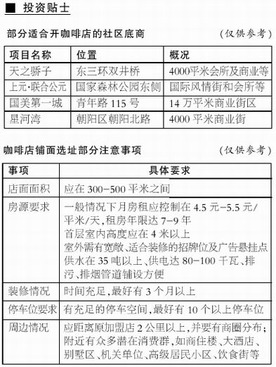 肖宇表示,咖啡加盟店是否经营成功,70%依赖于选址是否准确。由于北京禁止在住宅底商开设餐饮店,因此一般应该尽量在城市、城镇新旧区交接处、商业旺街以及虽不繁华但确有发展潜力的地段。选择购物消费人口集中的临街商厦和写字楼效果最佳。此外,一些附近有商圈的大型新兴社区的商业街,也适宜开咖啡店。