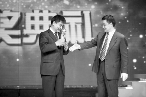 2007年1月20日,2006CCTV财经人物颁奖在北京中央电视台举行,刘永行(右)为新希望集团董事长刘永好颁奖。