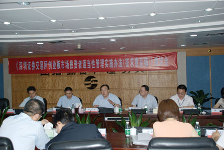 继6月5日发布《深圳证券交易所创业板市场投资者适当性管理实施办法(征求意见稿)》之后,为广泛了解各界人士对管理办法的意见,做好创业板推出投资者风险教育工作,2009年6月9日,深圳证券交易所特举办了《创业板市场投资者适当性管理实施办法》座谈会。各大券商经纪业务部门的代表、信托基金以及中小投资者代表数十人参加了座谈会并发言,针对相关条款和实施过程可能产生的问题提出了不少宝贵意见。