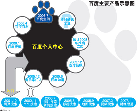 2005年以来,它先用贴吧、知道、百科、空间陆续构建了一个围绕着搜索展开的社区。而在2007年,它又先后进入了C2C和新闻领域。