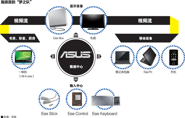 涉及Eee Keyboard时,即使公司内部也不乏质疑声音:“它真的会有市场吗?”但施崇棠所坚信的是,无论数字家庭战略如何宏大而虚无缥缈,至少有两个环节是躲不开的:输入和输出。既然如此,围绕键盘至少可以做些文章——虽然 Eee Keyboard在今年第二季度才会上市,但在CES上,它已经赢得了无数掌声。“直到全部消费电子产品被整合进来,Eee字头列车是不会熄火的。”全球顶级电子产品信息网站Engadget的美国编辑如此感慨。
