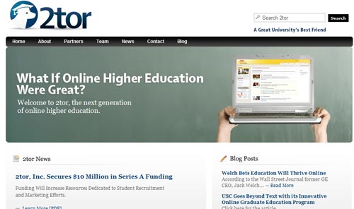 网络教育公司2tor是在2009年年初在美国纽约创建的,通过与各大高校建立伙伴关系,借助互联网建立、管理、推广在线网络教育。目前,2tor已与美国南加州大学的教育学院合作推出了MAT@USC,将在互联网上进行研究生教学。