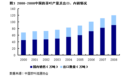 截至2008年底,中国茶叶的种植面积为2500万亩,产量接近120万吨,种植面积和产量都位居全球之首。